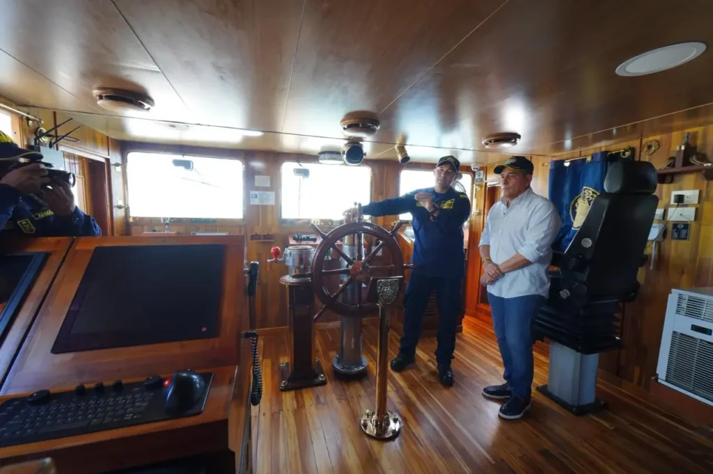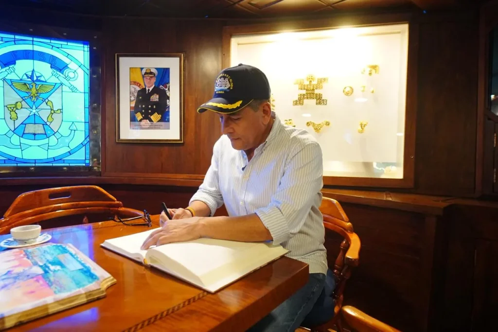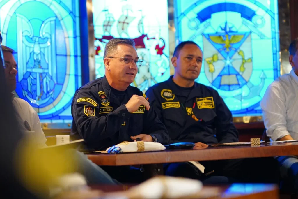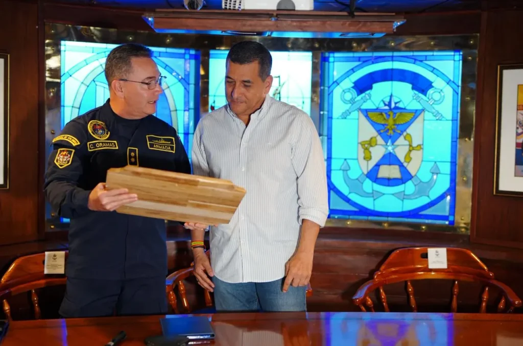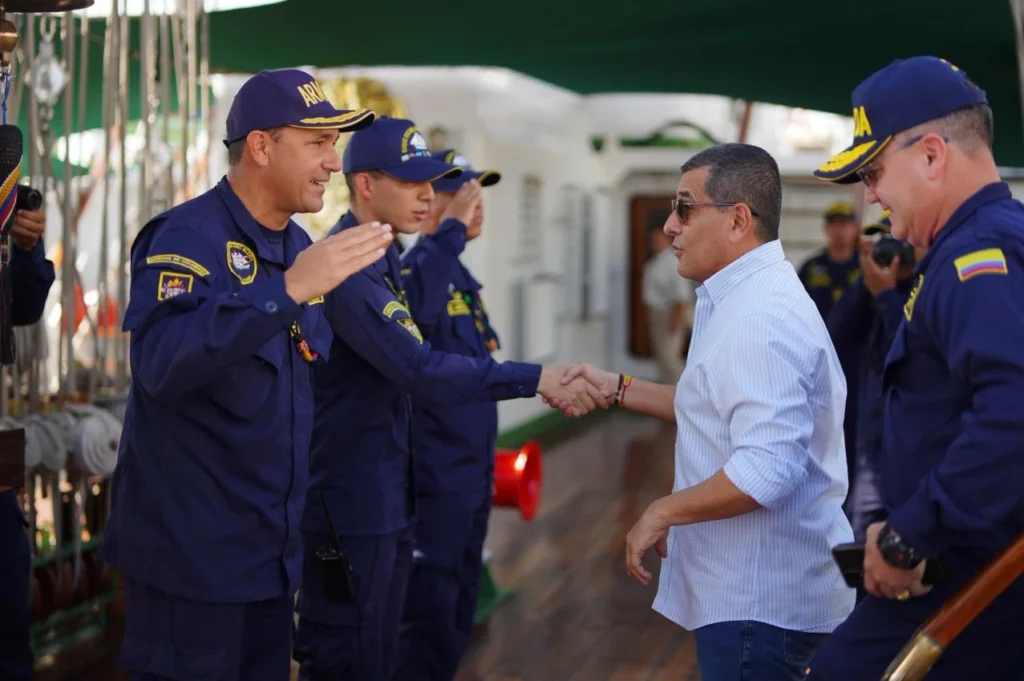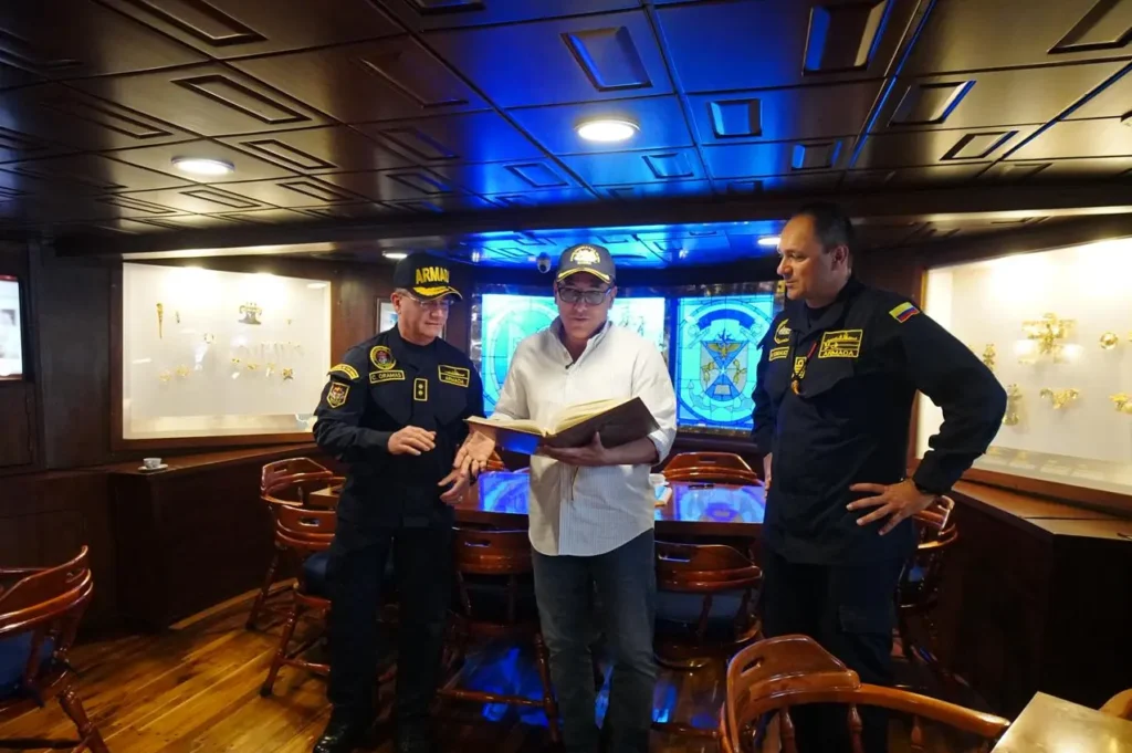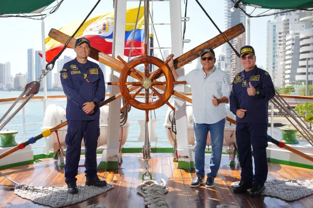 El alcalde Mayor de Cartagena, Dumek Turbay Paz, fue invitado por la Fuerza Naval del Caribe de la Armada Nacional a una mesa de trabajo y recorrido a bordo del Buque Escuela ARC Gloria, una reunión institucional liderada por el contraalmirante Carlos Oramas, comandante de la Fuerza Naval del Caribe, y altos mandos de la Armada Nacional, donde se abordaron los avances en materia de seguridad y el fortalecimiento del pie de fuerza marítimo, fluvial y terrestre en Cartagena y Bolívar.