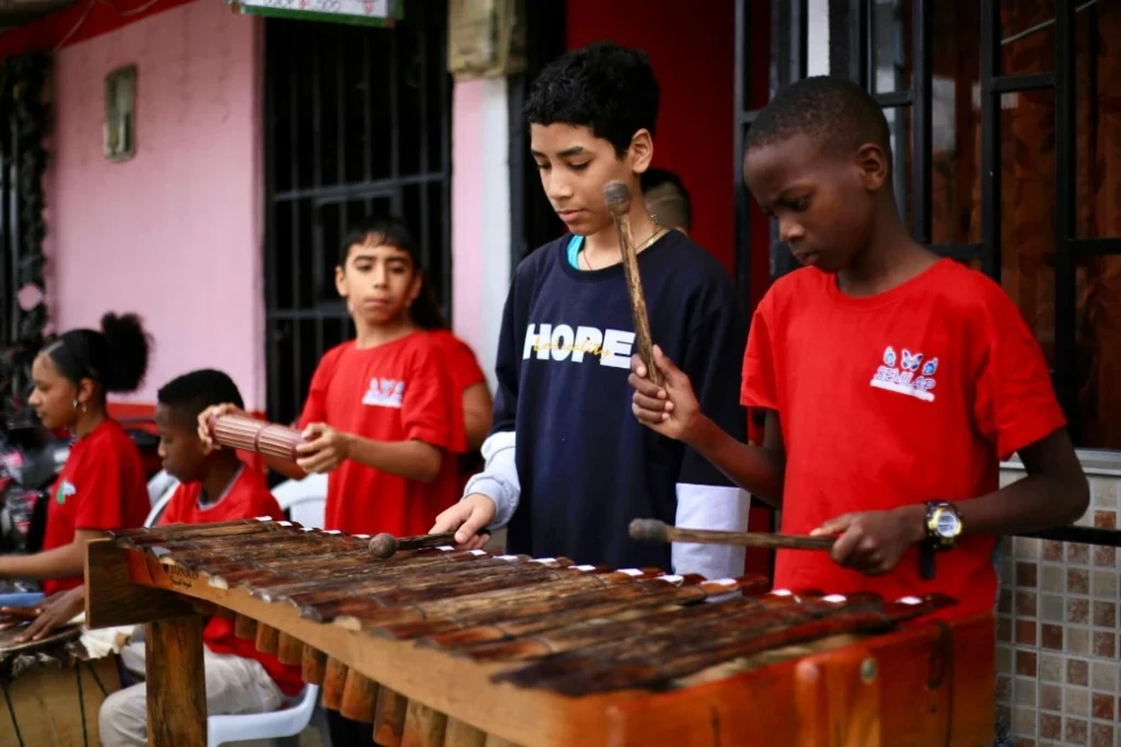 Durante la inauguración, el semillero de niños y niñas Libertad, Amor y Paz deleitó a los asistentes con cantos y marimbas, regalando a su comunidad una presentación llena de tradición y alegría.