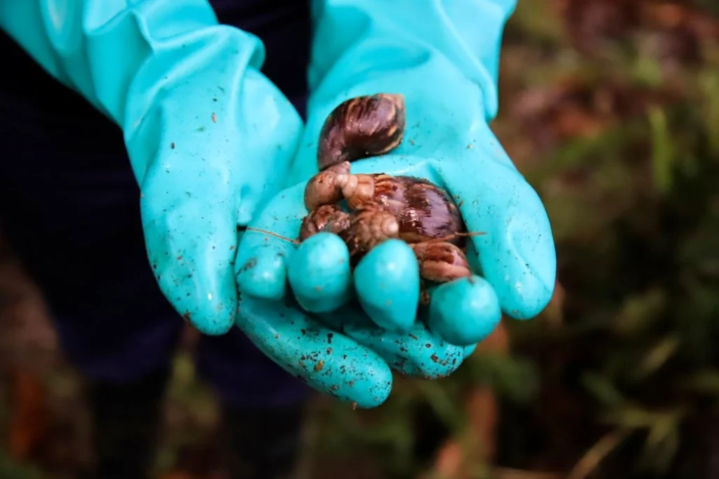Asimismo, se hizo especial énfasis en la necesidad de utilizar medidas de protección adecuadas al momento de manipular individuos del caracol gigante africano, como guantes, gafas y tapabocas. Esta especie puede ser portadora del nematodo que provoca meningitis y transmite bacterias de alta toxicidad, debido a que se alimenta de basura, heces y otros elementos en descomposición, representando un riesgo para la salud humana y animal.