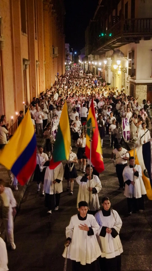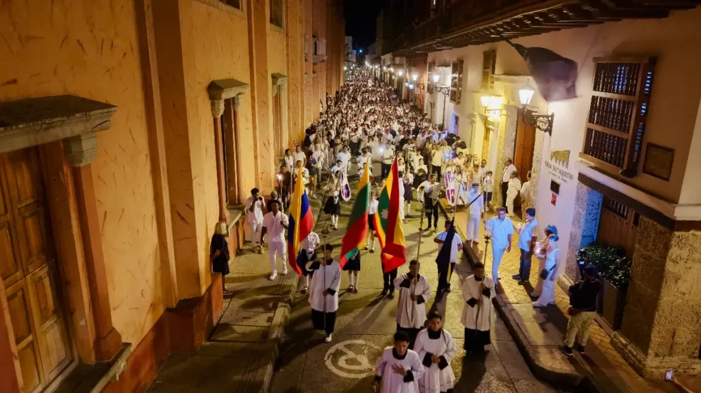 La jornada comenzó a las 6:00 p. m. con la formación de la procesión en la calle Sargento Mayor. El recorrido estuvo engalanado por la musical de las bandas de paz Los Titanes del Colegio Juan Pablo II y la Cartagena Marching Band, cuyos integrantes —niños y jóvenes apasionados por la cultura— prepararon el espíritu de los asistentes con un repertorio religioso y de marcha.