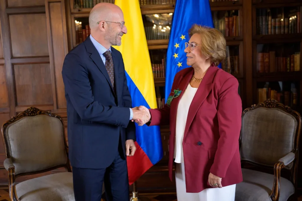 La ministra de Relaciones Exteriores, Rosa Yolanda Villavicencio, y el embajador de la Unión Europea en Colombia, François Roudié, sostuvieron un encuentro en el que reafirmaron la relación de socios entre Colombia y la Unión Europea, destacando resultados concretos en materia económica, de cooperación y de diálogo político en diversas áreas de interés común.