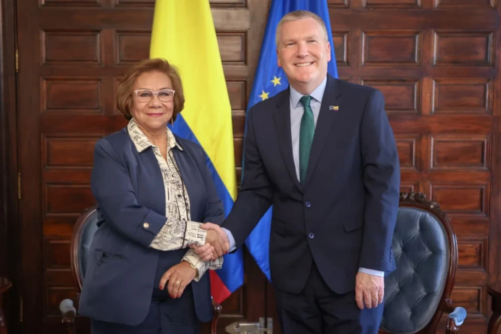 - La canciller Rosa Yolanda Villavicencio recibió en Bogotá al comisario europeo de Democracia, Justicia, Estado de Derecho y Protección del Consumidor, Michael McGrath, en un encuentro que reafirmó el sólido relacionamiento entre Colombia y la Unión Europea y permitió avanzar en una agenda conjunta en materia de cooperación judicial, fortalecimiento democrático y lucha contra la criminalidad transnacional.