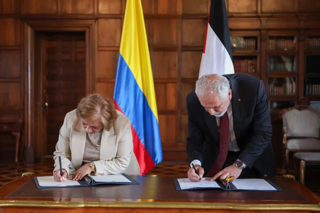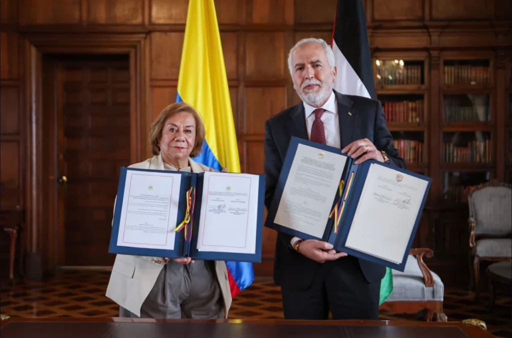La ministra de Relaciones Exteriores, Rosa Yolanda Villavicencio, suscribió con el Embajador del Estado de Palestina en Colombia, Raouf Almalki, el “Acuerdo sobre autorización para el ejercicio de actividades remuneradas para familiares dependientes del personal diplomático, consular, técnico y administrativo de las misiones diplomáticas y representaciones consulares”.