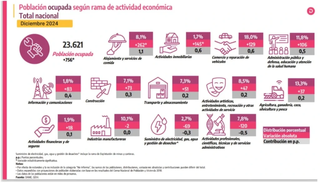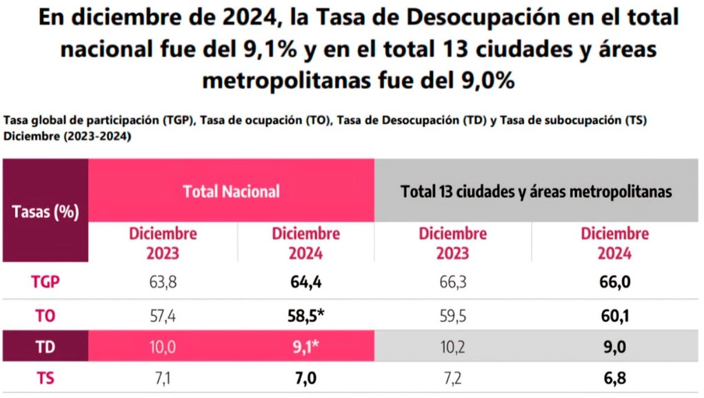 El informe señala que el aumento en la Tasa Global de Participación (TGP) fue, en diciembre 2024, de 0,5 puntos porcentuales (p.p.)., y pasó del 63,8 % al 64,4 %, mientras que el crecimiento en la Tasa de Ocupación (TO) fue de 1,1 puntos porcentuales ubicándose en 58,5 %, mientras que en diciembre de 2023 fue de 57,4 %.