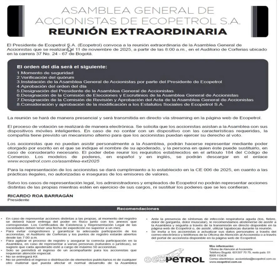 El Grupo Ecopetrol informó que el 11 de noviembre de 2025 se realizará la reunión extraordinaria de la Asamblea General de Accionistas. El propósito será, principalmente, la reforma de los Estatutos Sociales de la compañía estatal.