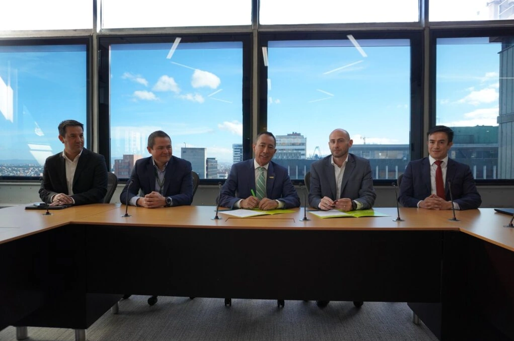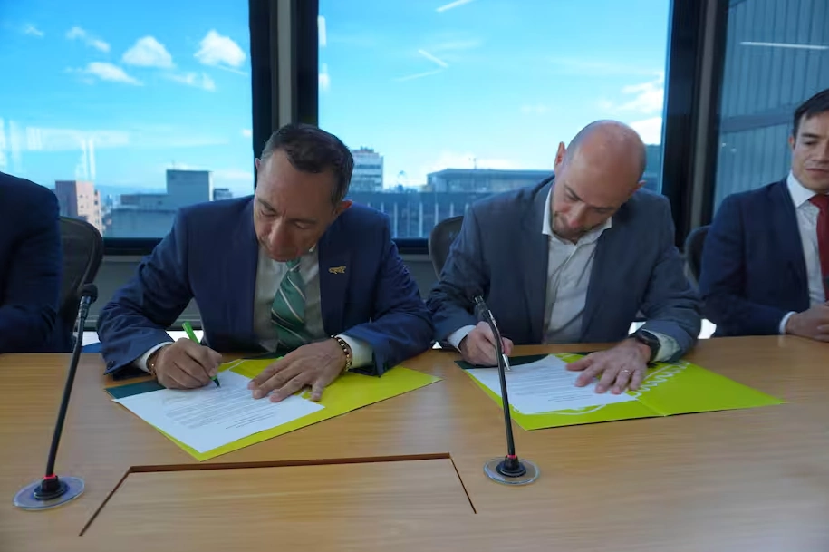 El presidente de Ecopetrol, Ricardo Roa, y Francesco Bertoli, gerente de Enel (der.), firman el documento para la compra del proyecto eólico Windpeshi. Foto – Ecopetrol
