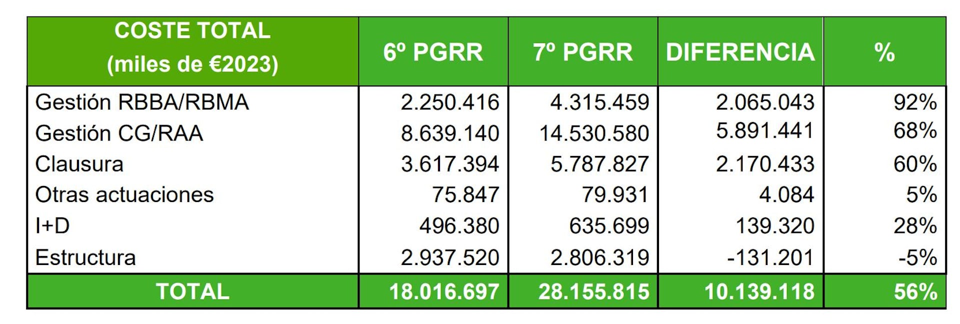 La diferencia entre el 6º y 7º Plan General de Residuos Radiactivos es de 10 140 de millones de euros, un 56 % más, en parte atribuibles a la necesidad de disponer varios almacenes en vez de uno. Además, el nuevo plan deja varias incognitas: