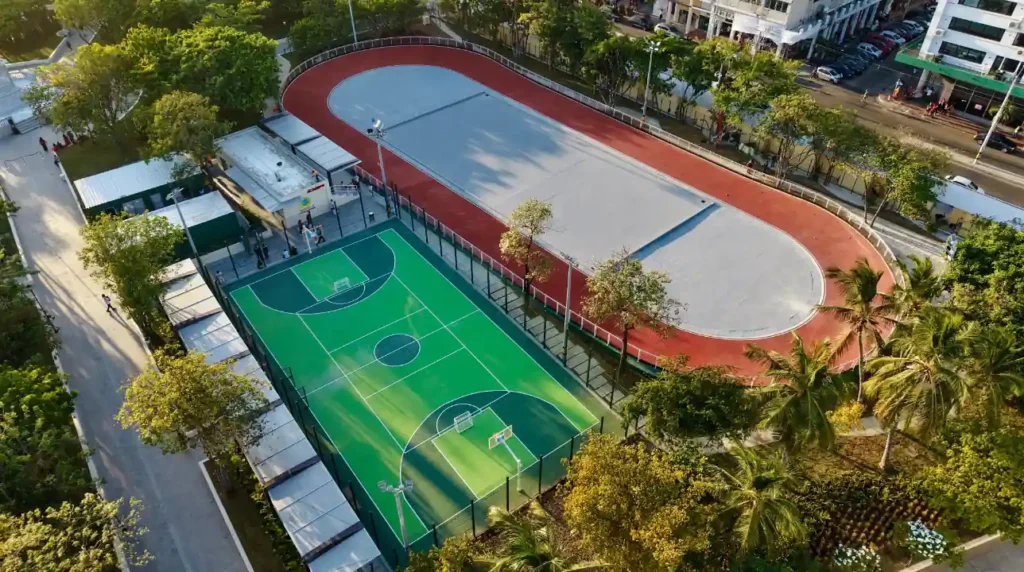 9. Espacio deportivos completamente restaurados y dotados con infraestructura deportiva pista de patinaje y cancha múltiple. Gradería y zona de servicios.