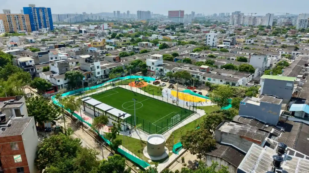 La obra abarcó la construcción de una cancha sintética de fútbol 6, cerramiento de alto impacto, graderías cubiertas, una zona de gimnasio al aire libre con máquinas biosaludables y áreas de calistenia, área infantil, andenes, espacios de circulación, senderos peatonales internos y externos, además de sistema de iluminación y siembra de plantas nativas.