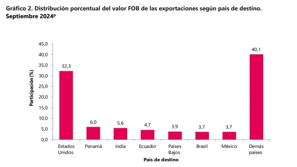 En septiembre de 2024 Estados Unidos fue el principal destino de las exportaciones colombianas con una participación de 32,3%. Le siguieron: Panamá (6%), India (5,6%), Ecuador (4,7%), Países Bajos (3,9%), Brasil (3,7%), México (3,7%) y demás países (40,1%).