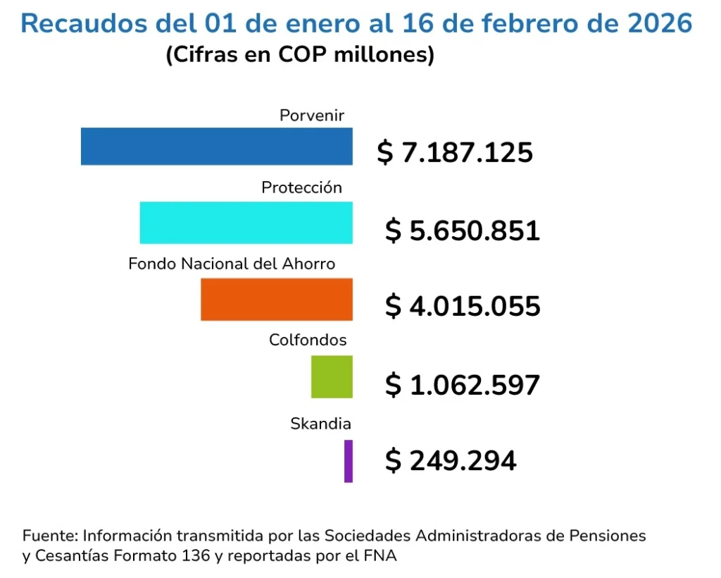 Según el documento, 77,9% del total pagado por los empleadores ($14,1 billones) fue realizado a través de las administradoras privadas y el 22,1% ($4 billones) a través del FNA. Estos recursos fueron consignados por los empleadores en los diferentes fondos entre el 1 de enero y el 16 de febrero pasado, de 2026.