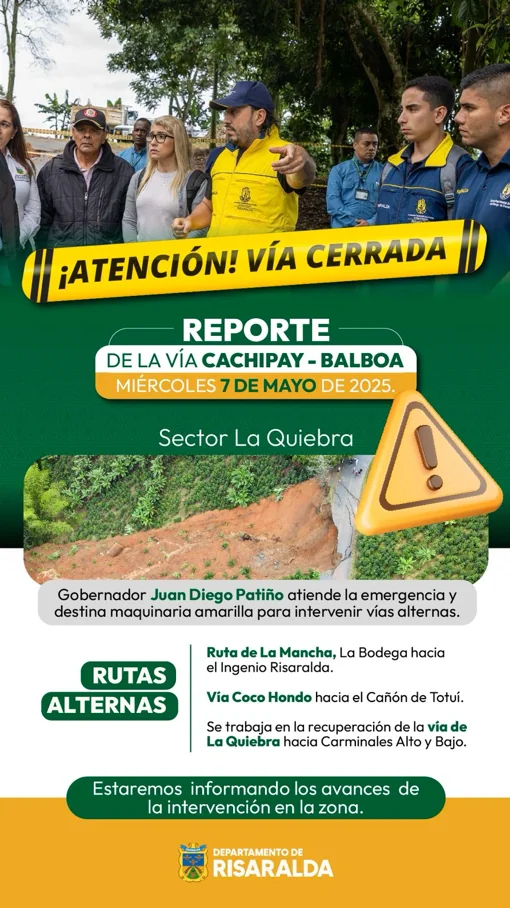 El alcalde de Balboa, José Ernesto Miranda Márquez, informó que, como parte de las acciones para mitigar el impacto de la emergencia vial ya se han habilitado tres vías alternas en el municipio. Estas incluyen la ruta de La Mancha, la bodega hacia el Ingenio Risaralda, y la vía Coco Hondo hacia el Cañón de Totuí.
