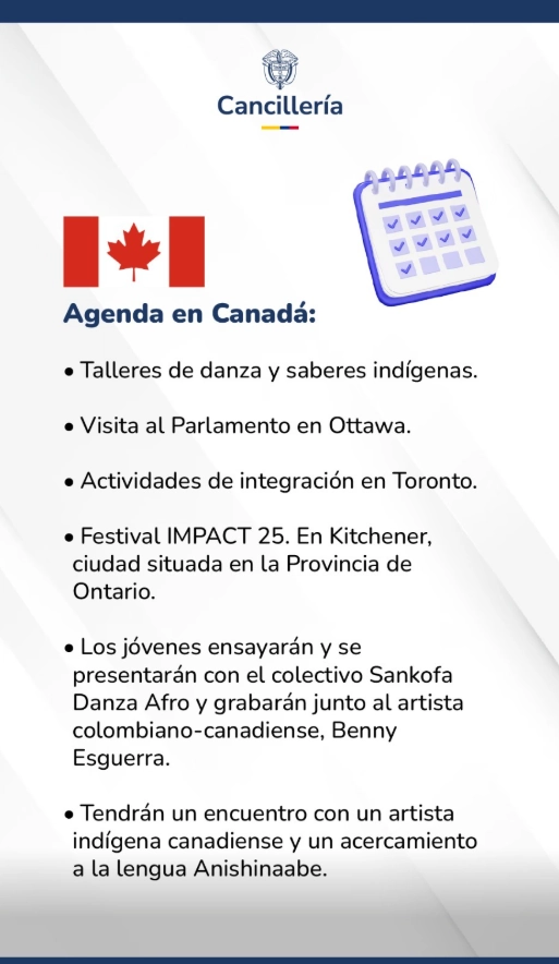 11 jóvenes provenientes de Mocoa, Putumayo, en el Piedemonte Amazónico, llevan a Canadá el talento y la resiliencia del territorio de Ingas y Kamentsa, fruto de una formación artística que, desde su propio territorio, siembra paz y esperanza. Entre el 19 y el 26 de septiembre, sus danzas y melodías interpretadas en quena, picullo, zampoña, charango, bajo y percusión resonarán en estas tres ciudades canadienses como parte de la Iniciativa de Diplomacia Cultural y Deportiva de la Cancillería de Colombia.