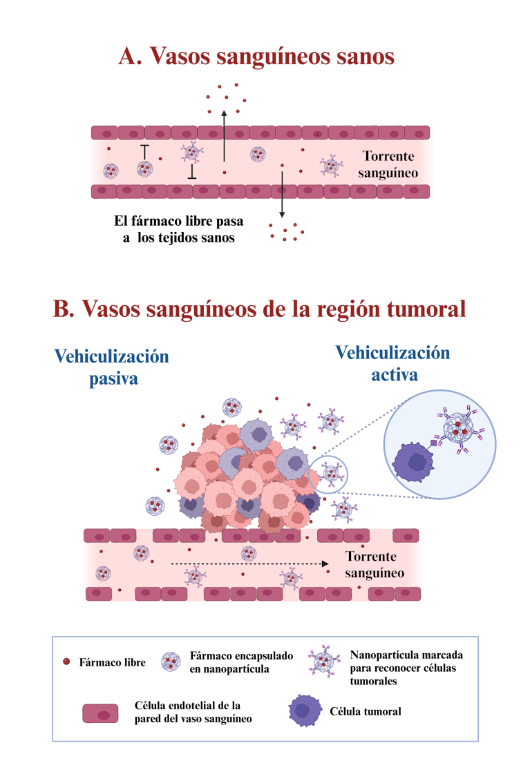 Una vez administrado al paciente el fármaco encapsulado en nanopartículas, este va viajando por el torrente sanguíneo hasta llegar a la región tumoral. A través de las ventanas de esos vasos especiales, las nanopartículas pueden escapar del torrente, acumulándose en el tumor. Este proceso se conoce como vehiculización pasiva del fármaco.