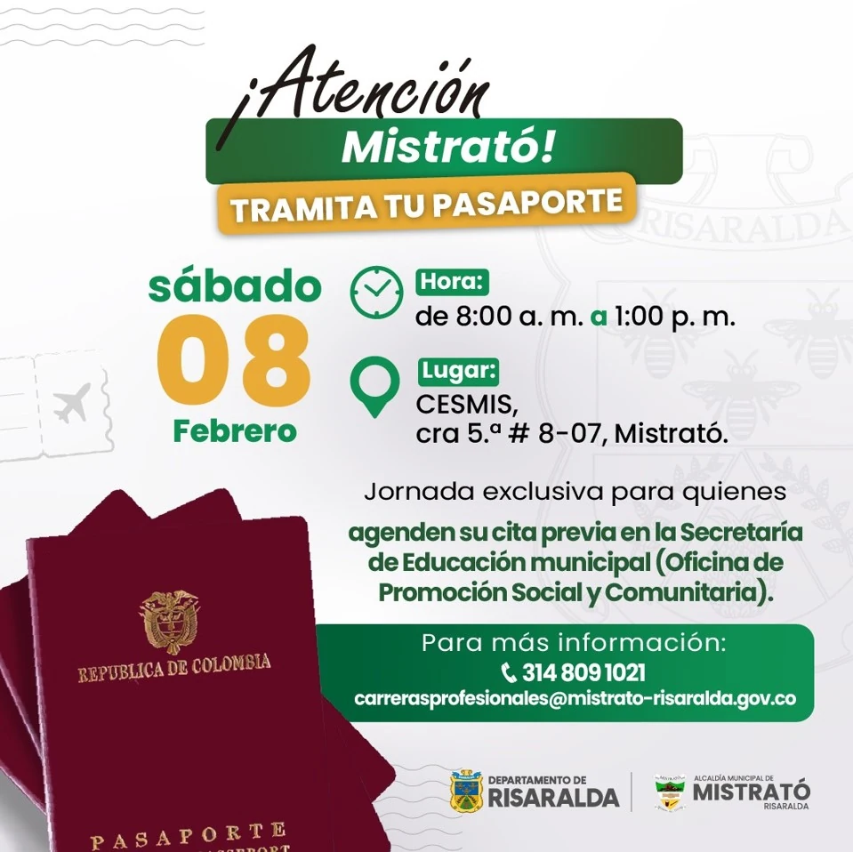 Pereira, 4 de febrero de 2025. Una nueva jornada de descentralización de pasaportes se vivirá en el municipio de Mistrató, este sábado 8 de febrero, entre las 8 de la mañana y la 1 de la tarde.