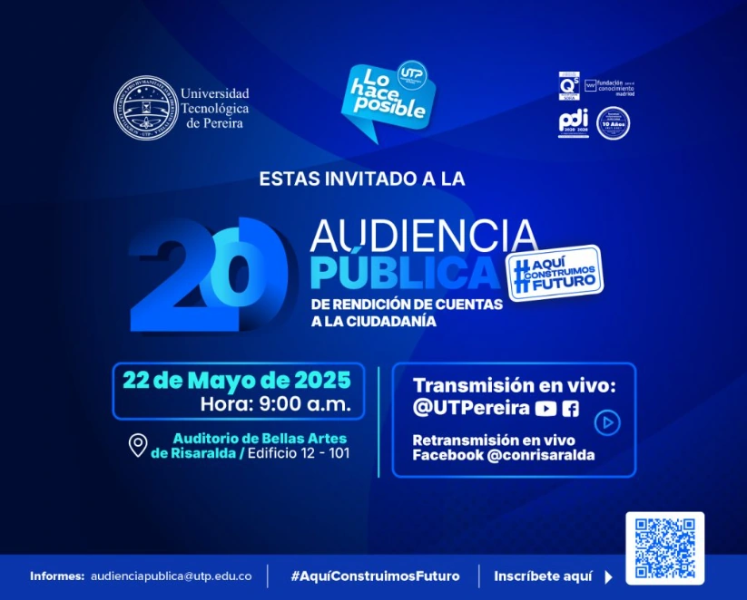 La Universidad Tecnológica de Pereira invita a toda su comunidad universitaria a ser parte activa de la 20.ª Audiencia Pública de Rendición de Cuentas a la Ciudadanía, un espacio institucional para conocer, consultar y expresar inquietudes sobre el presente y futuro de la Universidad.