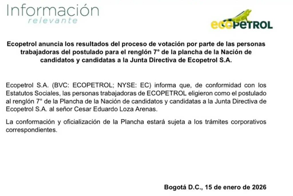 Se espera que en los próximos días la Junta Directiva de Ecopetrol se reúna para formalizar la designación de Loza Arenas como nuevo integrante de la máxima instancia de la compañía estatal, y que en marzo próximo sea elegido el noveno integrante que hace falta.