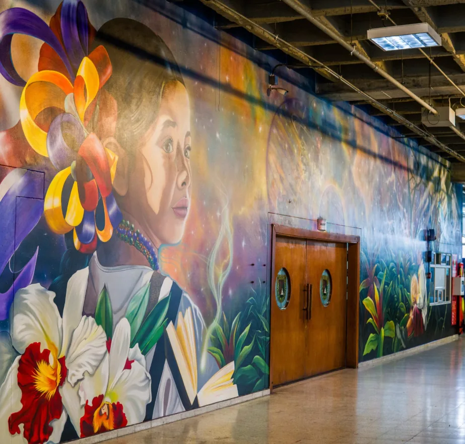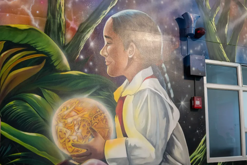 La pintura que fue realizada por el reconocido artista Juan Carlos Cepeda, con el acompañamiento de Jennifer Correa y Aris Valentina Díaz, tiene una dimensión de 20,3 metros de ancho por 4,5 metros de alto, otorgando identidad al espacio y narrando a través de imágenes, las raíces campesinas, la riqueza de la tierra, y la fuerza de la niñez; como símbolo de esperanza, así como la conexión espiritual con el cosmos y la energía que lo rodea.