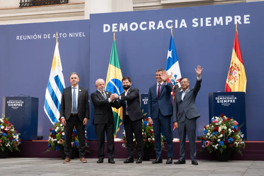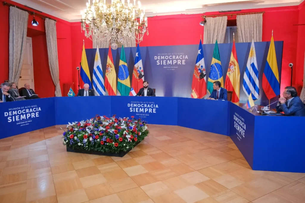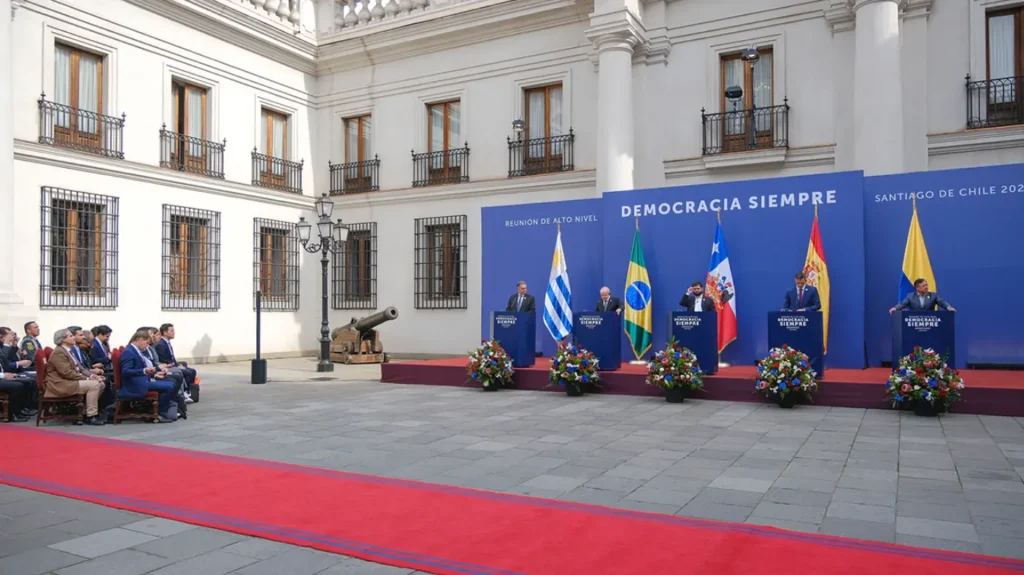 Al término de la reunión de alto nivel bautizada “Democracia siempre” -de la que el Gobierno de Chile fue el anfitrión desde la Casa de la Moneda-, cada uno de los presidentes de los cinco países participantes, en su orden Colombia, Uruguay, España, Brasil y Chile, expusieron sus impresiones y puntos de vista como resultado del encuentro.