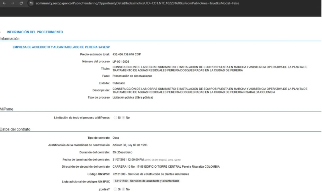Para Mónica Paola Saldarriaga Escobar, gerente de la empresa Aguas y Aguas de Pereira, este avance representa un logro significativo, recalcando que “este es un gran paso en la consolidación de un proyecto de impacto metropolitano como lo es la PTAR. Esta gran noticia que entregamos hoy a la ciudadanía es el resultado de un trabajo articulado y constante con el Ministerio de Vivienda, Ciudad y Territorio, y con todos los actores que han contribuido a su cierre financiero, así como del equipo técnico de Aguas y Aguas de Pereira que lo ha venido liderando con rigor y alto nivel de detalle. La PTAR avanza conforme a su cronograma, hoy, con mucha alegría, podemos anunciar la publicación de la Licitación Pública en el SECOP II, lo que reafirma nuestro compromiso por cumplirle a los pereiranos y, con ello, saldar una deuda ambiental histórica con nuestras fuentes hídricas”.