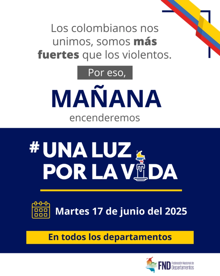 La jornada, de carácter simbólico, fue convocada con el fin de enviar un mensaje colectivo de unidad, esperanza y rechazo a la violencia que golpea a distintas regiones de Colombia. Bajo el lema “Una luz por la vida”, se invita a la ciudadanía a encender una vela a las 5:00 p. m. de este martes, como muestra de unión en defensa de la vida, la paz y la dignidad humana.